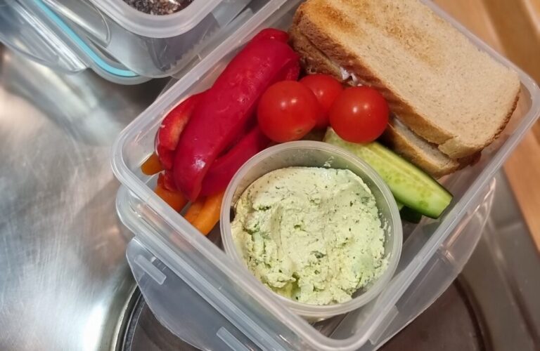Wiener Würstchen mit Butter-Toast, dazu frische Gemüsesticks (Salatgurke, Mini-Möhrchen, Honigtomaten und rote Paprika) mit Bärlauch-Dip. Als Dessert Erdbeeren mit Vanillesoße und für zwischendurch einen Hafer-Riegel…